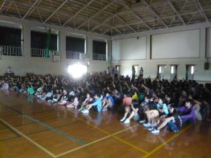 子どもたちが,元気良くクイズに答える様子です。しっかり列にも並べていて,下級生のお手本にもなりますね。