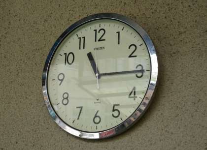 では,ここで先生からもんだいです!しゃしんにうつっているとけいのじこくは,なんじなんふんでしょうか?