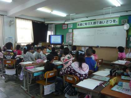 算数科では, パソコンを利用して子どもたちにとって分かりやすい授業を進めています。テレビにクイズ形式のように出てくる問題に興味津々です。