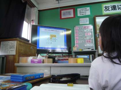 3けた×3けたの筆算の学習を,大画面のテレビを使って学習を進めています。子どもたちは,しっかり先生の話を聴き,テレビの画面,ホワイトボードをじっくり見て学習しています。