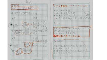 2.理科,メダカのオスとメスの見分け方や,飼育の方法などを絵や文章でまとめました。