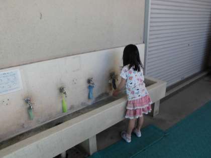 今日は,気温が上がり,とてもいい天気になりました。外で運動すると汗ばむ陽気ですが,教室へもどる時は,きちんと手洗いをしています。