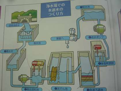 社会科の時間に,水道水のつくり方について学習しました。子どもたちは,琵琶湖疏水から蹴上,山ノ内,松ケ崎,新山科の各浄水場に地下の配水管を通って水が届くことを知り,大変驚いていました。市内の配水管を全部合わせると約4000kmということなので本当に長い距離の配水管があることが分かります。