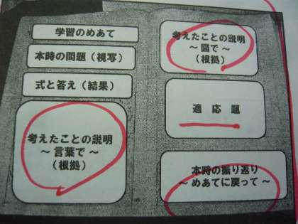 算数科では,問題把握,自力解決,集団解決,適応題の順に1時間の学習を進めています。ノートづくりはその1時間の授業で学習したことがしっかり分かるように非常に重要です。写真は,そのノート作りの一つの例です。高学年に向けて少しづつノート作りがレベルアップできるように,支援していきたいと思います。
