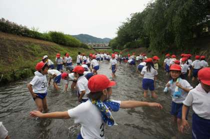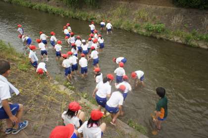 今日は、総合の学習で学校の前のありす川に入りました。