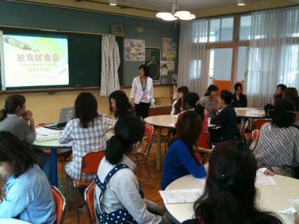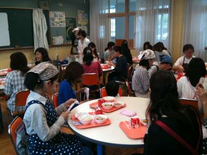 栄養教諭の赤井先生の話を聞いた後,身支度を整えて給食室へ。配膳を終えて楽しく給食をいただいている姿が見られました。
