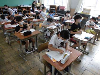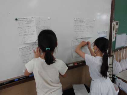 これまで家庭学習や授業で学習してきたことを確認するプリントに取り組みました。分度器の使い方や三角定規の角の大きさを確認できました。自分で丸付けをして,間違えていたらすぐに直すようにしました。