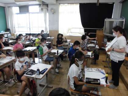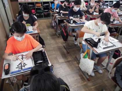 習字道具を久しぶりに使うので,筆も固まっていました。まず,お手本をなぞりながら,筆の動きを確認しました。その後,実際にお手本をなぞりましたが,静かな雰囲気で集中していました。