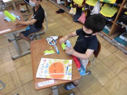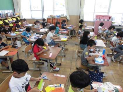 今日の図工は,紙を折ってたてるとどんな形ができるかいろいろ作ってみました。思い思いの形をハサミで上手に切ることができました。