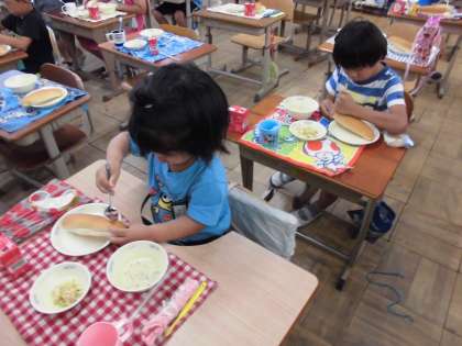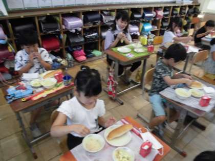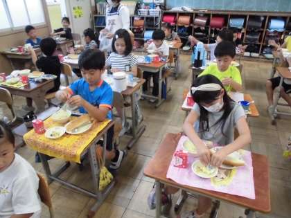 今日の給食は,ツナサンドでした。パンを上手に半分にし,間にツナをはさんで食べました。みんなおいしそうに食べていました。