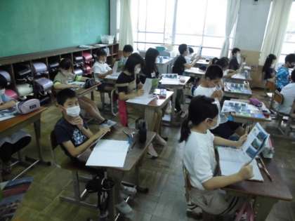 社会の時間には,日本の航空写真を見て気づいたことをもとに,国土の様子について考えました。京都のように山が多いことや海に囲まれていることなどに気づくことができました。