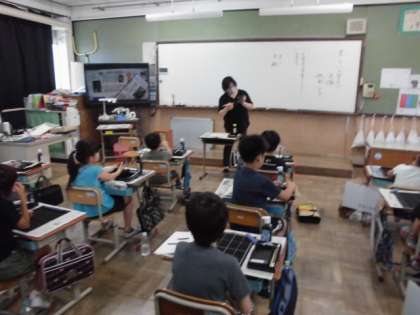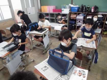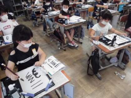 初めて習字道具を使って学習しました。入っているものの名前を確認したり,置く場所を確認したりしました。覚えることがたくさんありましたが,習字道具を初めて使える喜びが表情から伝わってきました。早速,筆を使ってみると,書けた黒い線を不思議そうに見ていました。