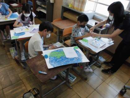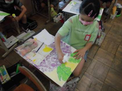今日はいよいよ背景を塗りました。紙を丸めたものを使ってポンポンと色を置いていきました。筆とは違う味わいのある色が塗れました。
