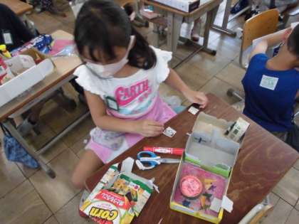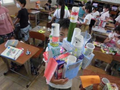 図工の時間には,空き箱やプラスチックの容器などを使って,自慢のお家が出来上がりました。オリジナルのお風呂があったり煙突があったりして,いろんな工夫が見られました。出来上がった作品を喜んで見せてくれました。