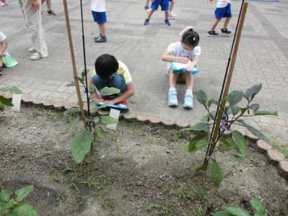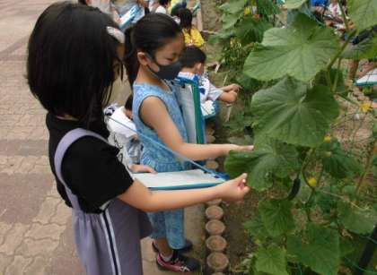 生活科の時間には,中庭で育てているキュウリやナスなどの夏野菜を観察しました。背丈が伸びていたり葉が大きくなっていたりと成長を感じていました。大きな葉を触ってみると,チクチクした手触りがあり,よく見ると毛のようなものが生えていました。その葉の後ろには,小さなキュウリができていました。