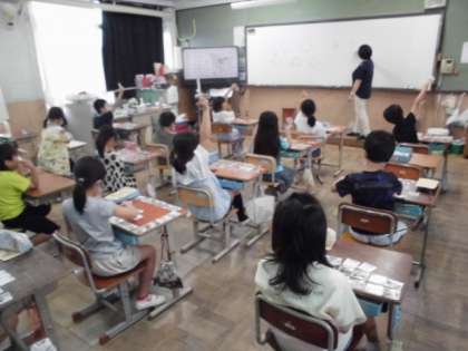 社会の時間に学習した地図記号をみんなで確かめました。机の上に用意したカードの中から先生が言った場所の地図記号カードを見つけます。みんな意欲的に取り組んでいて,中には見つけやすいように工夫して並べている子もいました。