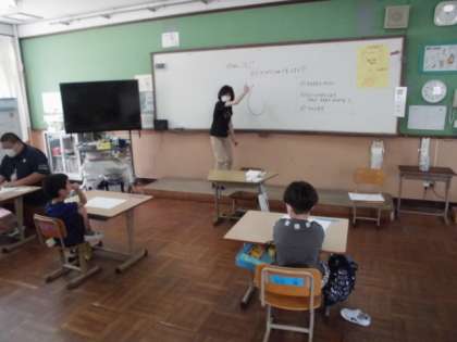 1年生は,ひらがなの「も」を学習しました。先生のお手本を見ながら書き順を確かめた後,プリントに練習しました。3年生は漢字の学習にも取り組んでいました。