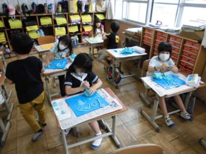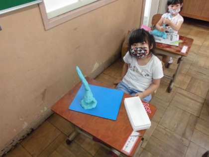 図工の時間には,粘土を使ってひもを作り,自分なりにおもしろい形を作りました。手でこすり合わせたり粘土板の上で転がしたりして上手に粘土をひも状にしていました。できた形をたくさんの子が見せてくれました。