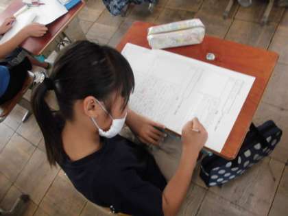 図書室や給食室など学校のいろんな場所をアップとルーズで伝えるために今日は,下書きをもとに清書しました。きれいな字で読みやすく書いていました。