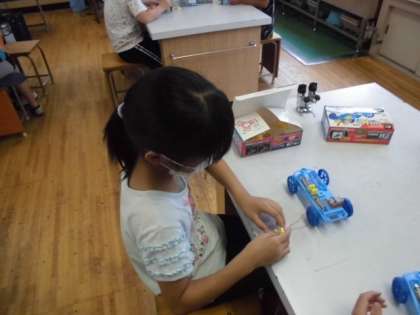 理科の時間には,もっとモーターを速く回したり豆電球を明るくしたりするには,どうしたらいいか考えました。実際に電池とつないで明るくなるかどうか実験しました。