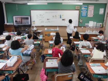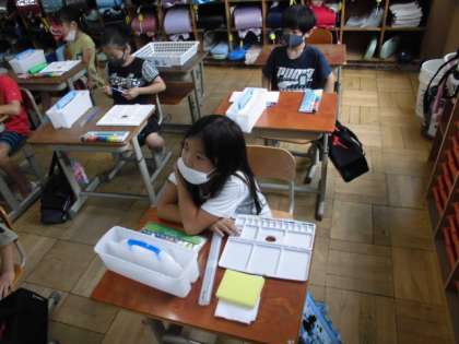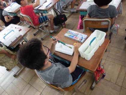 今日の図工では,絵の具の使い方を学習しました。筆やパレットといった用具の名前や使い方を知りました。また,筆を洗ったり色を塗ったりするのに水をたくさん使うことも知りました。