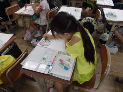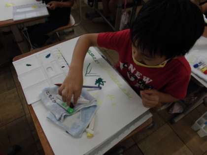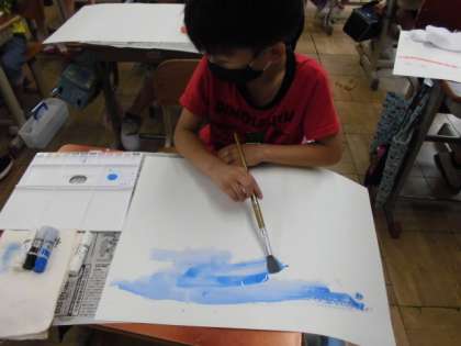 絵の具を実際に使ってみました。絵の具を出した時「絵の具の匂いがする」と感じた子もいました。筆に水をつけて塗ってみたり形を描いたりしました。思っていたような色や形が描けると嬉しそうにしていました。