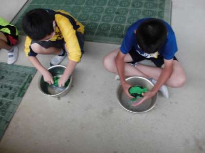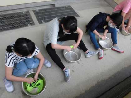 今日の授業では,学習したことをもとに実際に洗濯をしました。今は洗濯機で洗うことが多いですが,手で洗っても汚れが落ちるけど,大変さが分かりました。