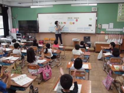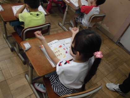 今日の音楽では,言葉でリズムを作って楽しみました。「タン」や「タタ」のリズムに合うように言葉を探し,自分で言いながら手でリズムを打ちました。