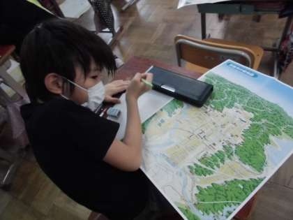 今日の社会では,京都市の様子を調べました。地図には,土地の様子も書いていますが,まずは,鉄道について調べました。京都駅を中心にして見てみると,たくさんの鉄道があることが分かりました。