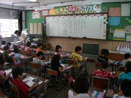 1年生は,国語の「くちばし」という教材を学習しています。大きな声で音読しています。また,廊下では図工の作品が掲示してあります。
