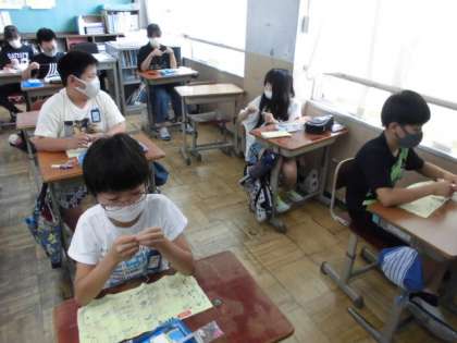 今日の家庭科の時間には,「ボタン付け」に挑戦しました。まず,やり方を教えてもらってから動画を見て確認しました。イメージがもてたところで針と糸の準備をしました。