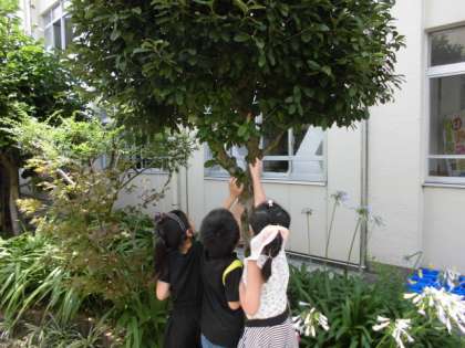 中庭にいる生き物を探しました。石の下にはおおきなミミズがいて,びっくりしていました。木の葉をよく見ると,セミの抜け殻がついていました。雨がやんで,生き物たちもようやく活動開始です。