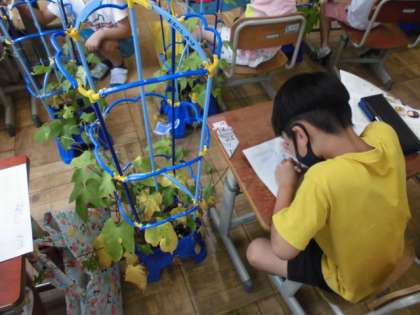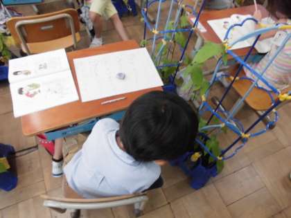 今日は,あさがおの様子を観察して記録しました。葉の大きさや枚数,色,形などいろんなところに目を向けて,言葉で説明していました。