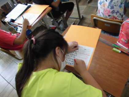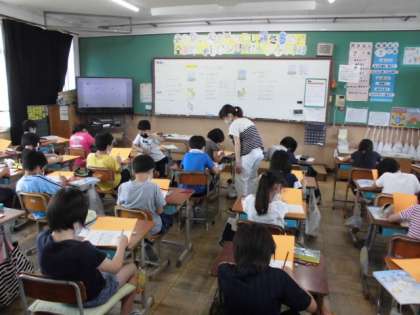 今日は,英語を使って友達を自分の好きな遊びに誘ってみることを学習しました。自分の好きな遊びを出し合い,その単語を使って誘ってみました。振り返りでは,誘うことができたと満足そうにしていました。