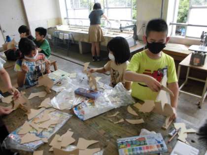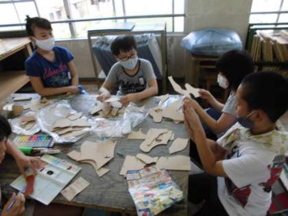 今日の図工では,電動糸のこぎりを使って板を切り,切った後の形から自分が想像したものに組み立てていました。色を塗ることでよりイメージに近づいていました。