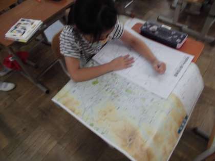 今日は,白地図を使って,京都市の各区ごとに色分けしました。隣に向日市や長岡京市があることや鉄道でつながっているところがあるなど気づきました。
