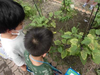 4日間も休みがあったので,中庭の野菜も急に大きくなったように感じました。大きな葉やきれいな花,そして実もたくさん見つけました。よく見ると,テントウムシが葉の上にいました。