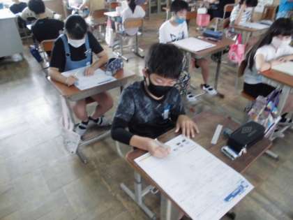 今日の算数では,これまでに学習したことがどれくらい理解できているかを確かめるテストをしました。学習してからしばらく時間が経つと忘れてしまいがちですが,今回,できなかったところは,夏休みに復習しておいてほしいです。