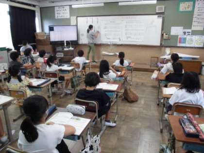 音楽の時間には,「ゆかいな木きん」という曲を学習しました。テンポの速い曲なので,秘密を探ると,2拍子という言葉が出てきました。1学期に学習した音符をもとに,2拍子について理解を深めていました。