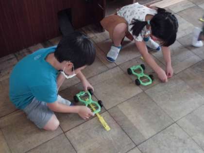 理科の時間には,ゴムの力を使って車を走らせました。ゴムが伸び縮みする力を利用することが分かり,引っ張る強さで走らせる距離が調節できることにも気づいていました。