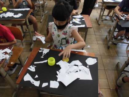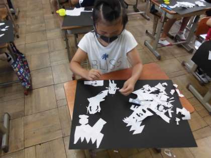 白い紙を思いつくままに切った後,組み合わせて形を作りました。黒い画用紙に貼っていくので,白色がとてもきれいに目立ちました。こんな感じになったよと見せてくれる子もいました。
