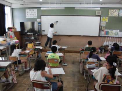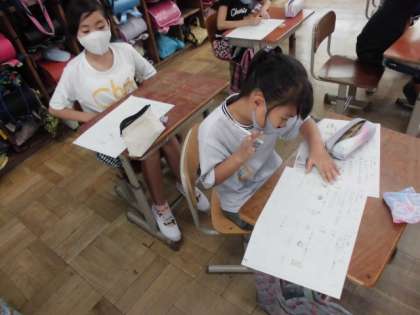 「すいか」や「すし」など,サ行のローマ字を学習しました。くねくねした「S」の文字をバランスよく書くことに苦労している子もいました。