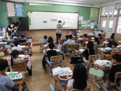 音楽の時間には,曲に合わせて「ド」と「ソ」の音を鍵盤ハーモニカで演奏しました。リズムよく息を入れないとみんなと合わせることができません。曲をよく聞いてタイミングよく演奏することができました。