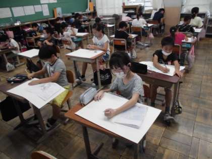 図工の時間には,お話の絵の下絵をもとに画用紙に描きました。全体の構図に注意して,描きたいもののバランスを再度考えて描いていました。画用紙に描くとなると,少し緊張している様子が伺えました。