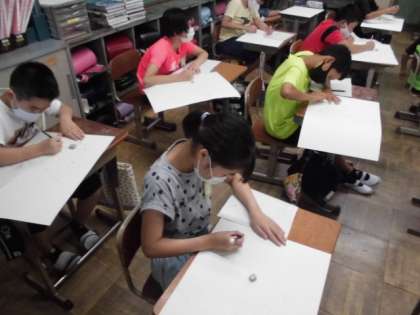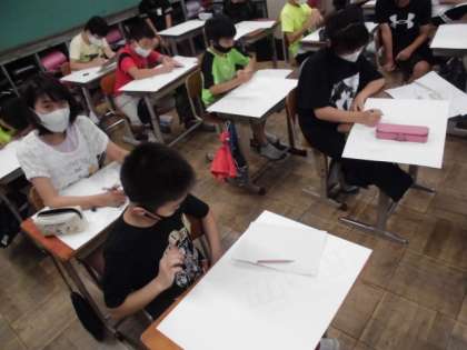 前の時間に描いた下絵をもとに,いよいよ画用紙に描いていきました。全体のバランスを考えながら電車の大きさや位置を決めていました。タイヤ向きや人物の表情など細かい部分までこだわって描いていました。