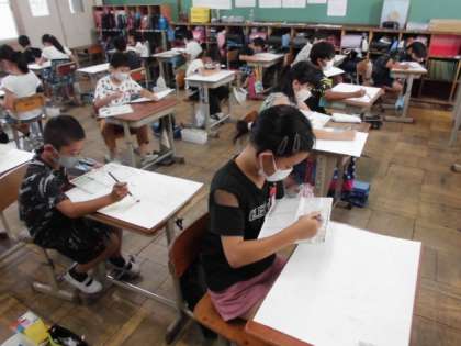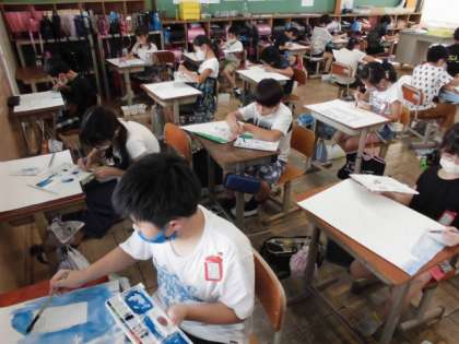 下絵が描けた人は,絵の具で色塗りを開始します。今日は,背景から色を塗りました。まずは,やや薄めに塗り,水で色の調整しながら進めていました。