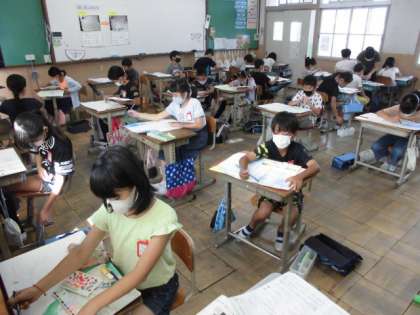 下絵も描けたので,自分の気に入った色を選んで背景を塗りました。夜の様子を表現するためには,黒や青などの絵の具を選びますが,暗くなり過ぎないように水の量を調節して薄めに塗るようにしていました。