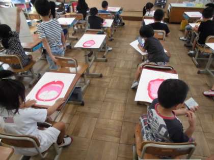 大きな口を開けている様子が描けたので,口の中の歯や舌も描きました。鏡をよく見て,赤やピンクに塗っていました。口が描けたら,次は,顔を描きます。鼻や目の形をよく観察していました。