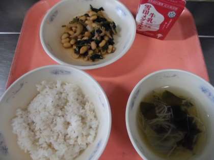 子供たちから,「『肉みそいため』は,みその味が,お肉や豆にもしみこんでいて,おいしかったです。『わかめスープ』は,シャキシャキしていて,野菜の甘味もあり,温かくておいしかったです。」と,感想をくれました。