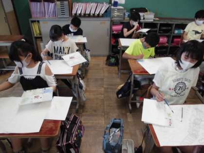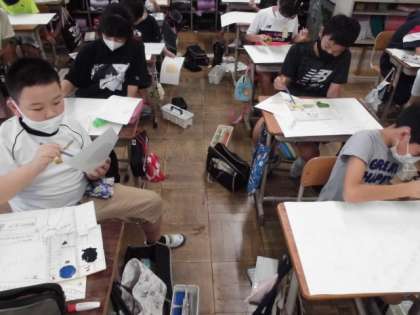水の量に気を付けて絵の具で背景を塗りました。色が濃すぎると全体的に重たくなってしまうので,まずは薄めに背景を塗ることにしました。自分が思っているよりも薄かったようで,友達と相談しながら水の量を加減していました。